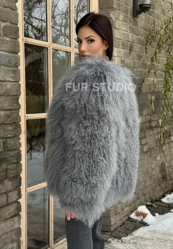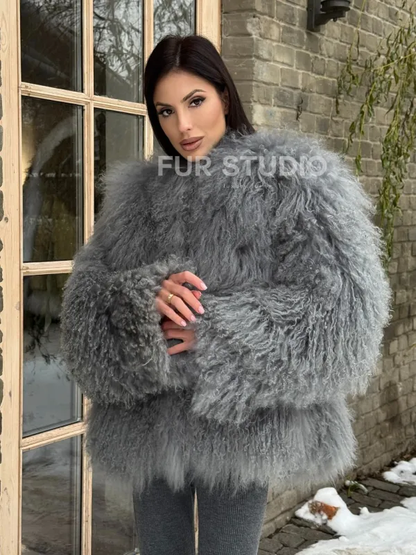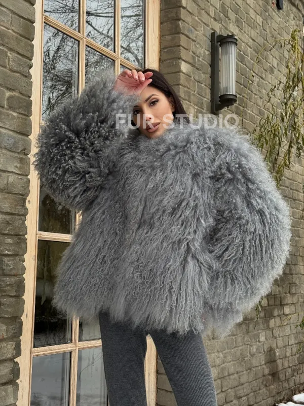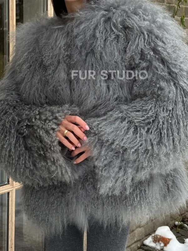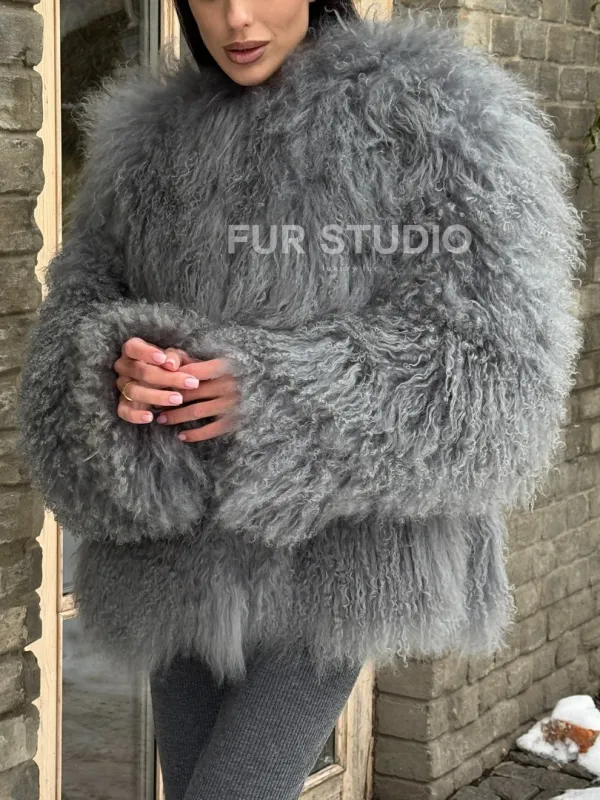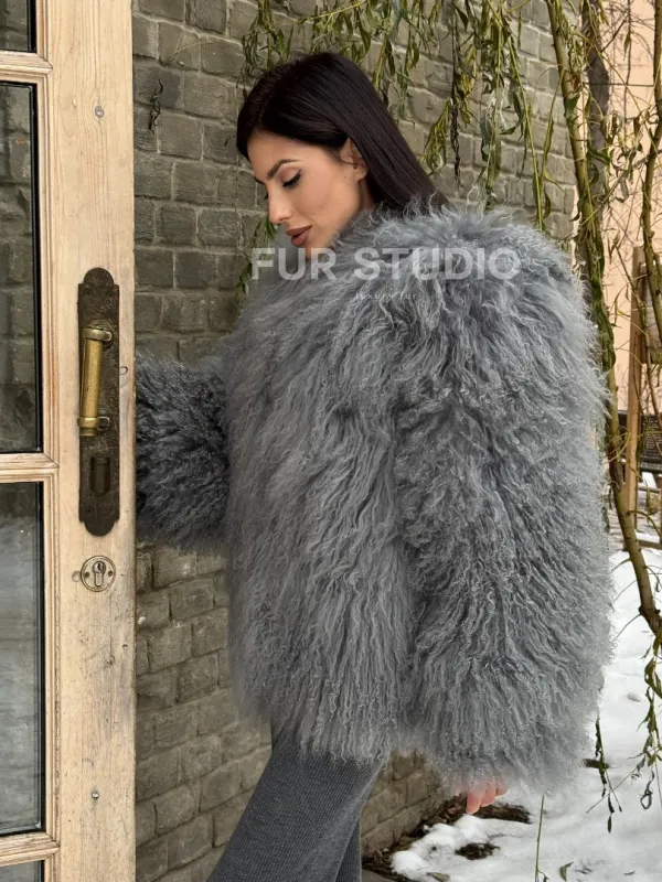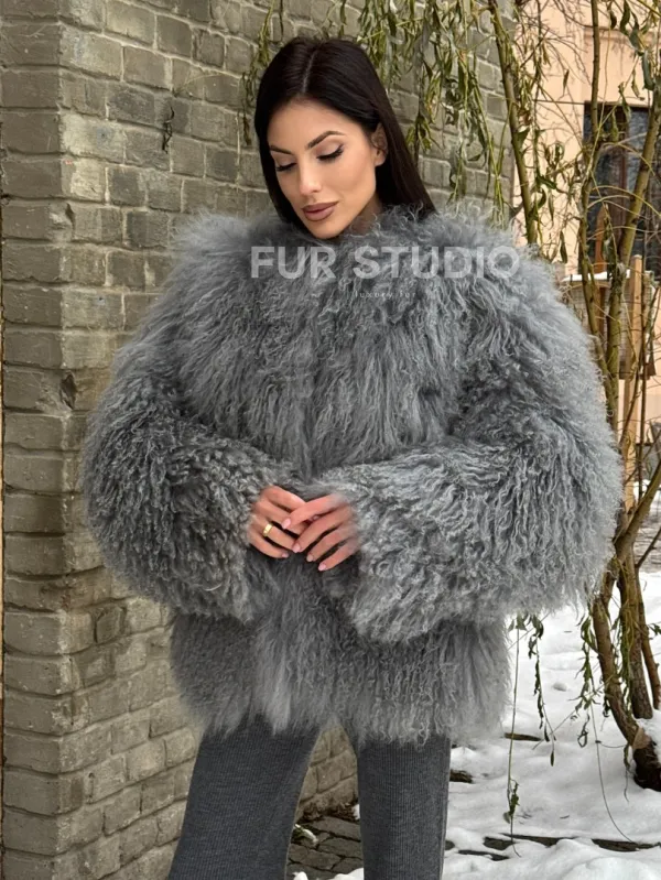 Шуба из меха ламы серого цвета 101435