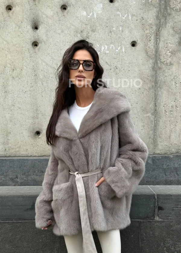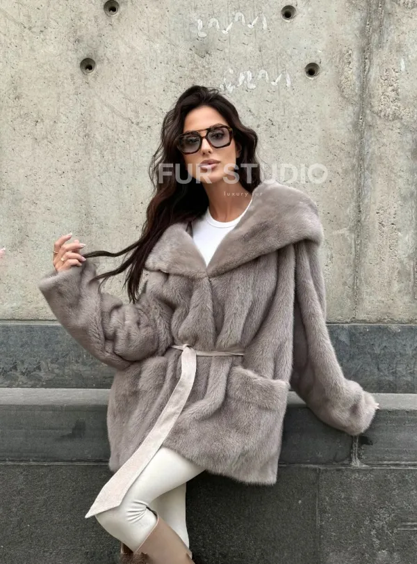 Шуба Oversize из меха цельной норки с капюшоном 101102
