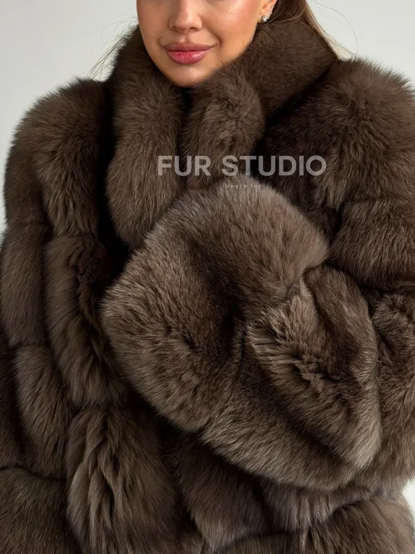 Мех данной шубы финский песец, цвет коричневый. Предлагается в размерах от 42 до 46. Длина модели 60-65 см, что выгодно подчеркивает фигуру девушек. Эта модель идеально подойдет для девушек и женщин, предпочитающих роскошные натуральные меха.