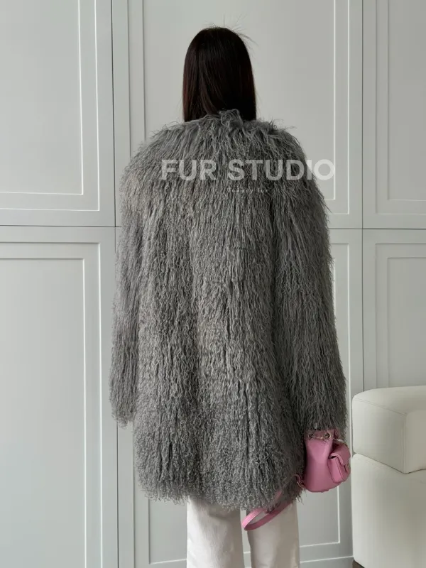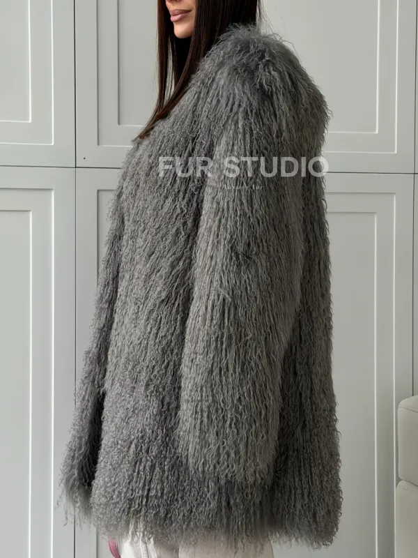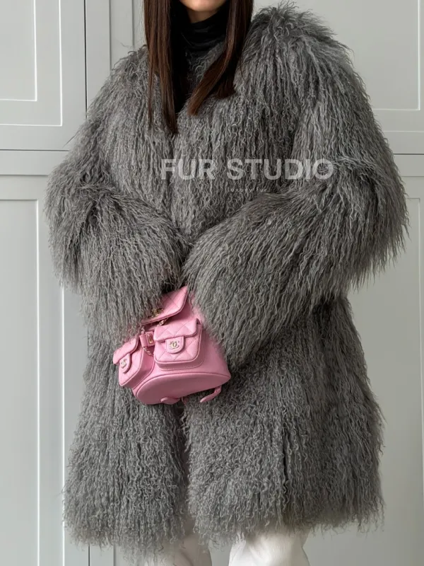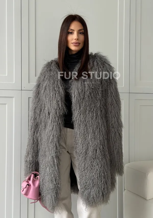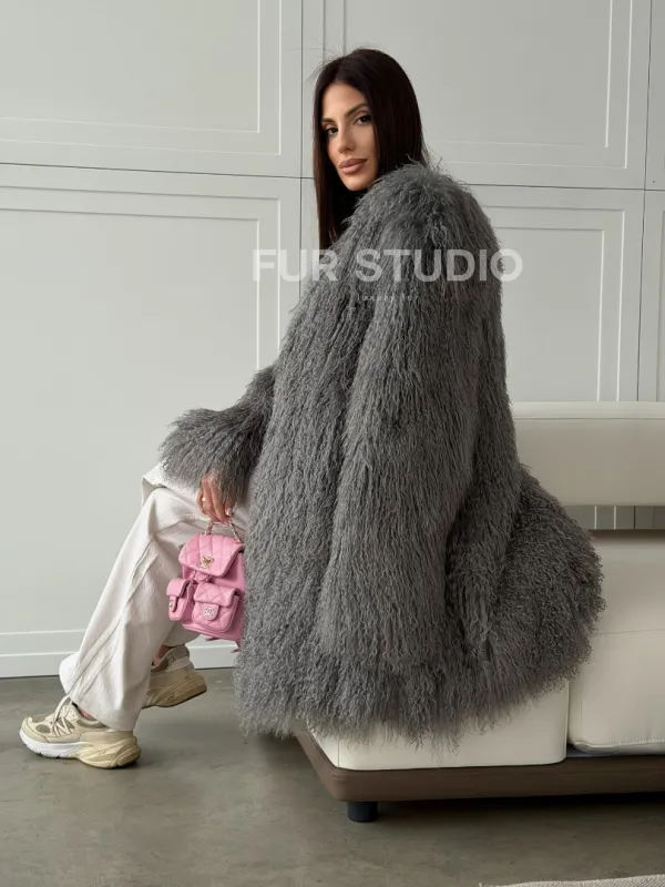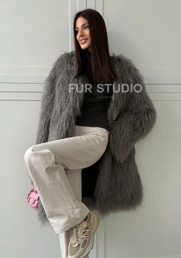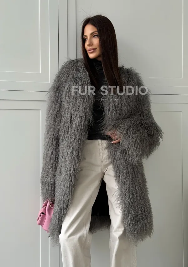 Удлиненная серая шуба из ламы 102810